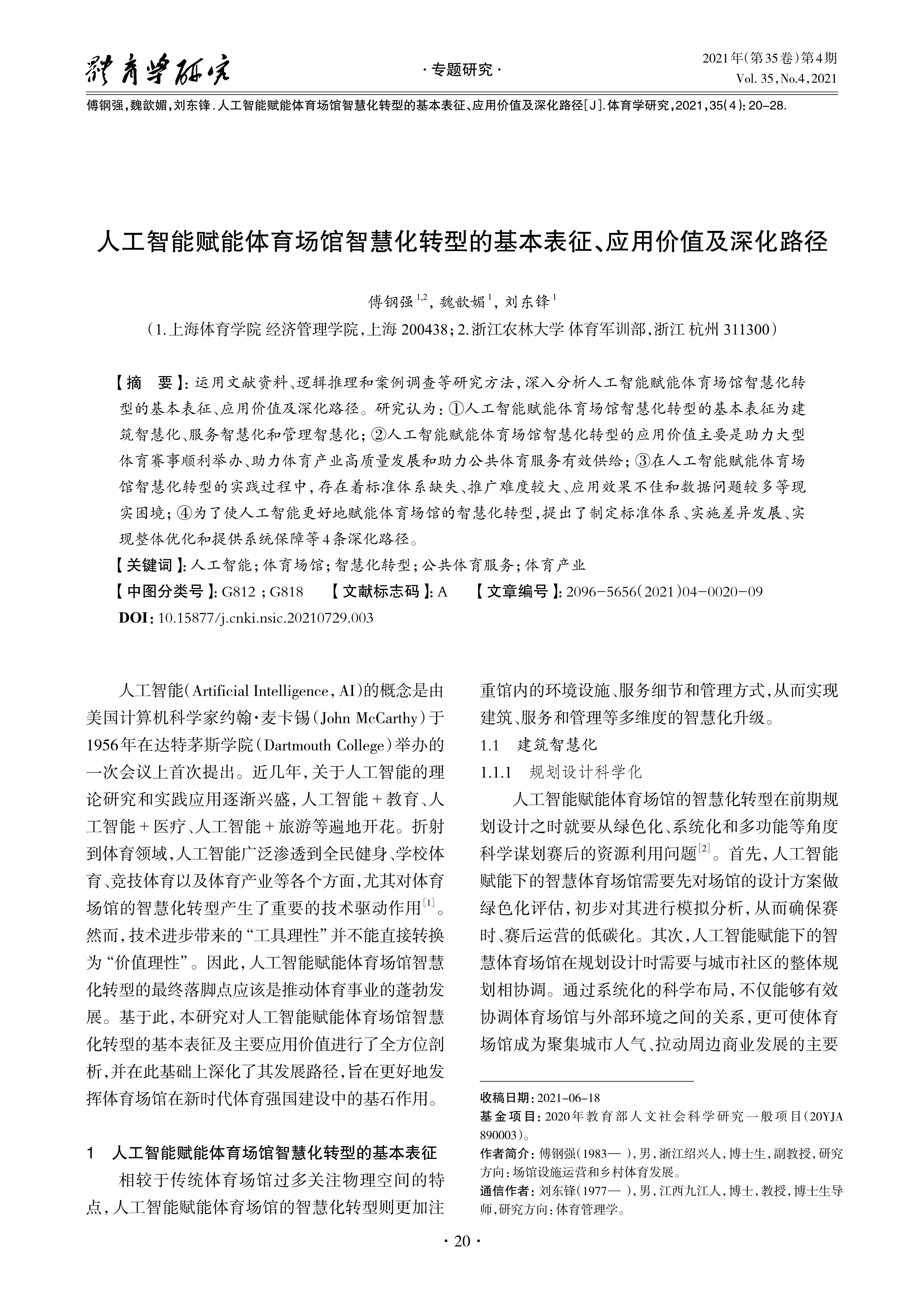 运用文献资料、逻辑推理和案例调查等研究方法,深入分析人工智能赋能体育场馆智慧化转型的基本表征、应用价值及深化路径。研究认为:①人工智能赋能体育场馆智慧化转型的基本表征为建筑智慧化、服务智慧化和管理智慧化;②人工智能赋能体育场馆智慧化转型的应用价值主要是助力大型体育赛事顺利举办、助力体育产业高质量发展和助力公共体育服务有效供给;③在人工智能赋能体育场馆智慧化转型的实践过程中,存在着标准体系缺失、推广难度较大、应用效果不佳和数据问题较多等现实困境;④为了使人工智能更好地赋能体育场馆的智慧化转型,提出了制定标准体系、实施差异发展、实现整体优化和提供系统保障等 4条深化路径。