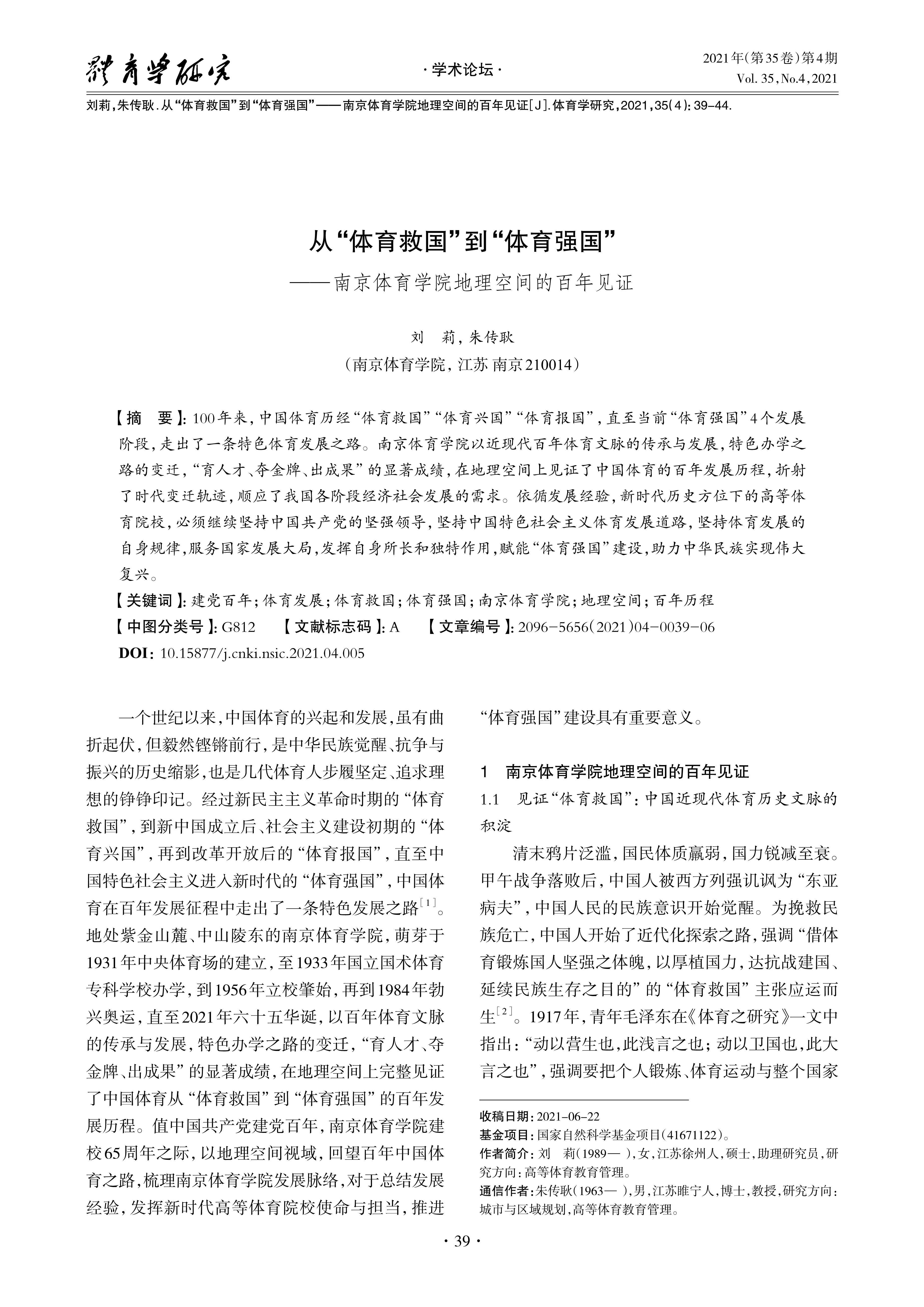For a hundred years,Chinese sports has embarked on a path of characteristic sports development from “sports saving the nation”,“sports rejuvenating the nation”,“sports serving the nation”, to the current new stage of “sports powering the nation”. With inheritance and development of modern sports culture in the past century, changes in the road of running a school with characteristics, and distinguished achievements of “fostering talents, winning gold medals, and producing results”, Nanjing Sport Institute has witnessed hundred years of development of Chinese sports in its geographic space, which reflflects the trajectory of era and needs of economic and social development at various stages of the nation. Based on the development experience, sports colleges and universities in the new era must keep uphold the strong leadership of the Communist Party of China, keep to the development path of socialist sports with Chinese characteristics, adhere to the law of sports development, target the needs of the nation, give full play to their own strengths and unique roles, promote the construction of “a leading sporting nation”, and help the Chinese nation achieve great rejuvenation.