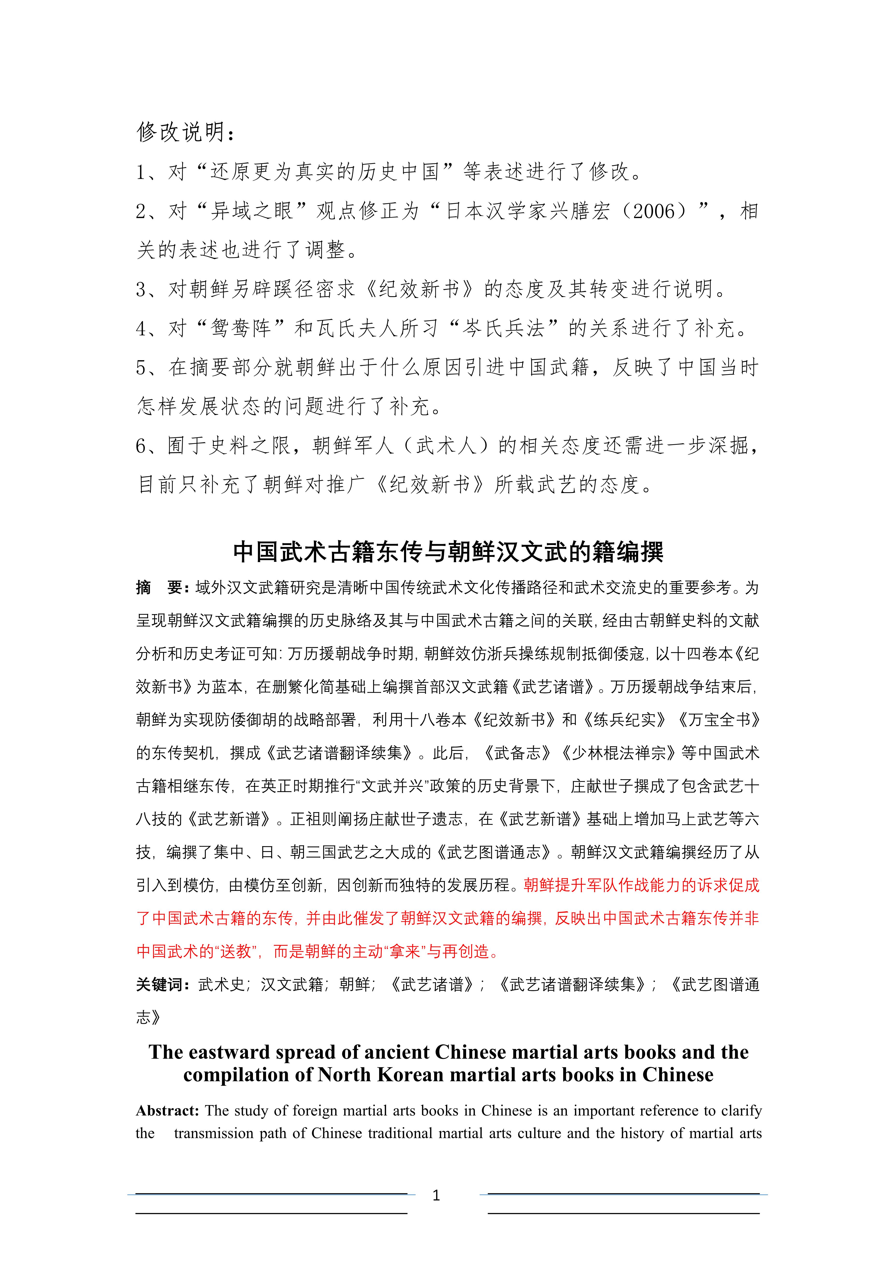 The study of foreign martial arts books in Chinese is an important reference to clarify the transmission path and communication history of Chinese traditional martial arts culture. In order to present the historical context of the compilation of North Korean martial arts books in Chinese and the relationship between it and ancient Chinese martial arts books, based on the documentary analysis and historical research of ancient North Korean historical materials, it can be concluded that the compilation of Chinese martial arts in North Korea is closely related to the eastward spread of Chinese martial arts. During the Aid Korean War in the Wanli period, North Korea followed the example of the Army in Zhejiang Province in training to resist the Japanese invaders and compiled the first Chinese martial arts books—— All The Spectrums of Martial Arts based on simplifying and paring down the fourteen-volume edition of Ji Xiao Xin Shu.After the the Aid Korean War in the Wanli period, in order to achieve the strategic deployment of defense against the Japanese and the northern barbarian tribes in ancient china, North Korea took advantage of the eastward spread for 18-volume edition of the Ji Xiao Xin Shu, the Documentary on Military Training, and the All-purpose Book to write a Sequel to the Translation of All The Spectrum of Martial Arts. Later, some ancient Chinese martial arts books, such as Wubeizhi and Shaolin Cudgel Chan sect, were spread to the east one after another. Under the historical background of carrying out the policy of ‘developing both civil and military affairs’ in the Ying Zheng period, prince sado wrote a new book New Spectrum of Martial Arts which contains 18 skills of martial arts.On the basis of New Spectrum of martial arts, Ching Cho expounded and spread the deathbed behest of prince sado then compiled General Record of Martial Arts Atlas , which added martial arts on horses and other six skills. It is a collection of martial arts on three countries including China、Japan and North Korea. The compilation of North Korean and Chinese Ancient Martial Arts Books has experienced a unique development process from introduction to imitation, from imitation to innovation, which can be seen from the historical coordinates of eastward spread of Chinese ancient Martial Arts Books. The clear relationship between ancient Chinese martial arts books and martial arts books of North Korea in Chinese could clarify the headstream position of Chinese traditional martial arts culture in East Asia, it can be used for reference in the transmission history of Chinese martial arts , the communication history between China and North Korea martial arts and the history of Oriental martial arts.