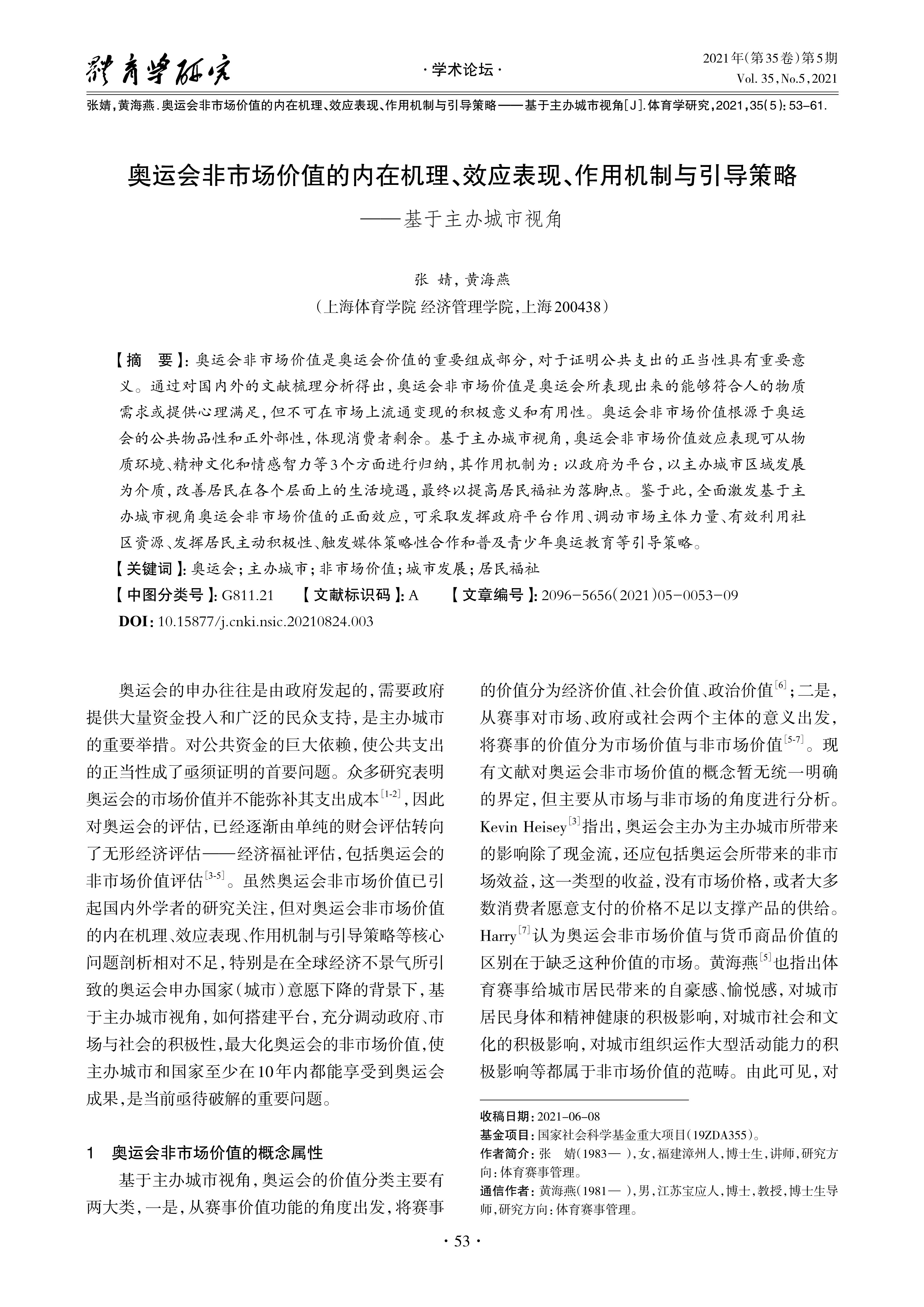 The non-market value of the Olympic Games is an important part of the value of the Olympic Games,which is of great signifificance to prove the legitimacy of public expenditure. Through reviewing the literature at home and abroad,this article indicates that the non-market value of the Olympic Games is the positive signifificance and usefulness of the Olympic Games,which can meet people's material needs or provide psychological satisfaction,but can not be realized in the market. The non-market value of the Olympic Games is rooted in the nature of public goods and positive externality of the Olympic Games,which reflects the consumer surplus. From the the perspective of the host city,the non-market value effect of the Olympic Games can be summarized into three aspects:material environment,spiritual culture and emotional intelligence. The non-market value of the Olympic Games takes the government as the platform and the regional development of the host city as the medium,so as to improve the living conditions of the residents in all living areas,and ultimately improve the welfare of the residents. In view of this,to fully stimulate the positive effect of the non-market value of the Olympic Games based on the perspective of the host city,we can take such guiding strategies as giving full play to the role of the government platform, mobilizing the main force of the market,making effective use of community resources,giving full play to the initiative of residents,triggering the strategic cooperation of the media and popularizing the Olympic education for teenagers.