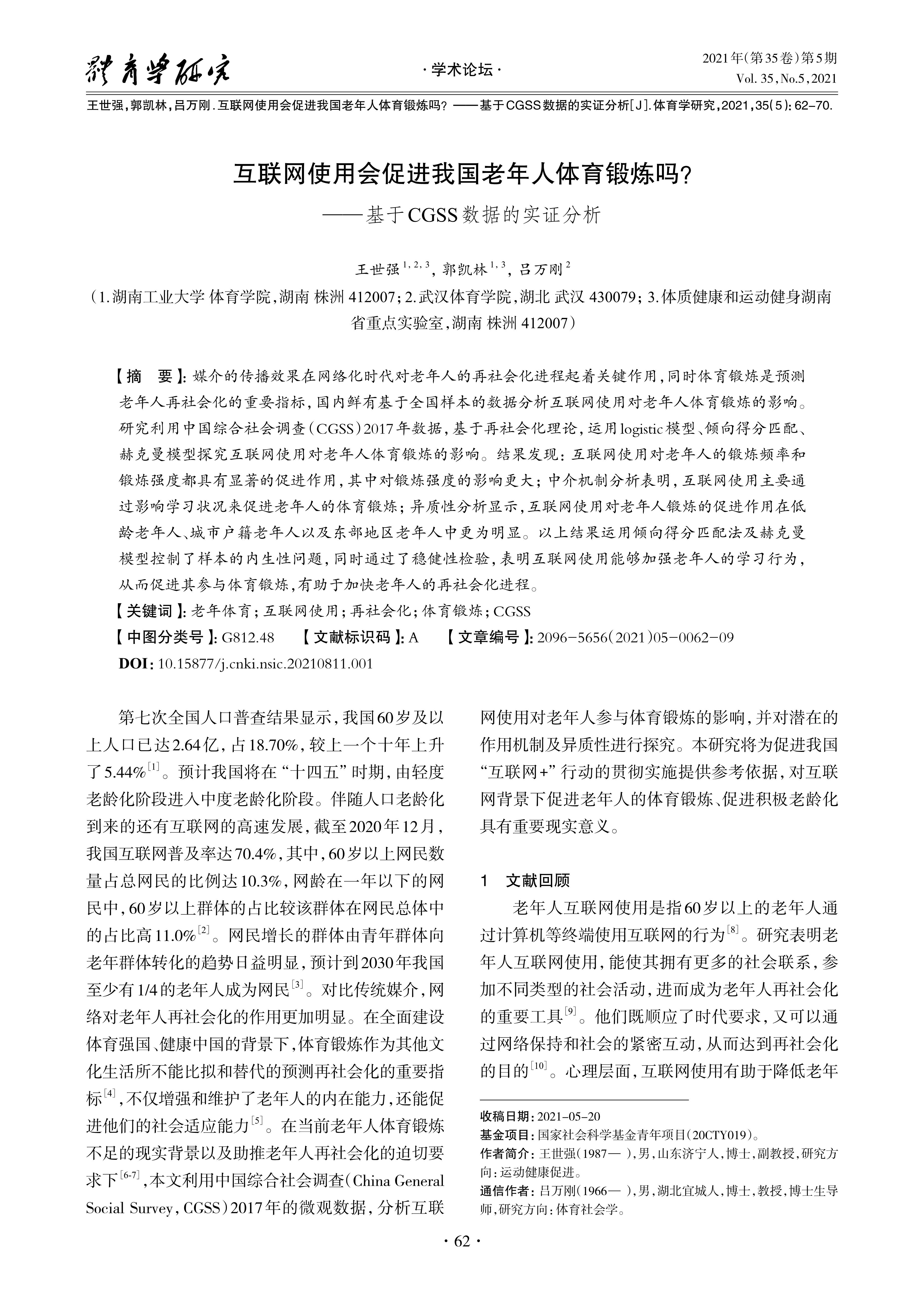 The communication effect of media plays a key role in the resocialization process of the elderly in the Internet age, and physical exercise is an important index to predict the resocialization of the elderly. In China,there are few data based on the national sample to analyze the impact of internet use on the physical exercise of the elderly. Based on the CGSS2017 survey data and the resocialization theory,this paper uses logistic model,tendency score matching,and Heckman model to explore the inflfluence of internet use on physical exercise of the elderly. The results show that internet use had a signifificant effect on the exercise frequency and intensity of the elderly,and the inflfluence on the exercise intensity was more signifificant. The mediating mechanism analysis suggests that internet use promoted physical exercise in the elderly mainly by inflfluencing learning status; The heterogeneity analysis indicates that the promotion effect of internet use on elderly exercise was more obvious in the younger elderly,the elderly with urban residence and the elderly in the eastern region. The above results used the propensity score matching method and the Heckman model to control the endogeneity of the sample,and passed the robustness test,indicating that the internet use can strengthen the learning behavior of the elderly,promote their participation in physical exercise,and accelerate the resocialization process of the elderly.