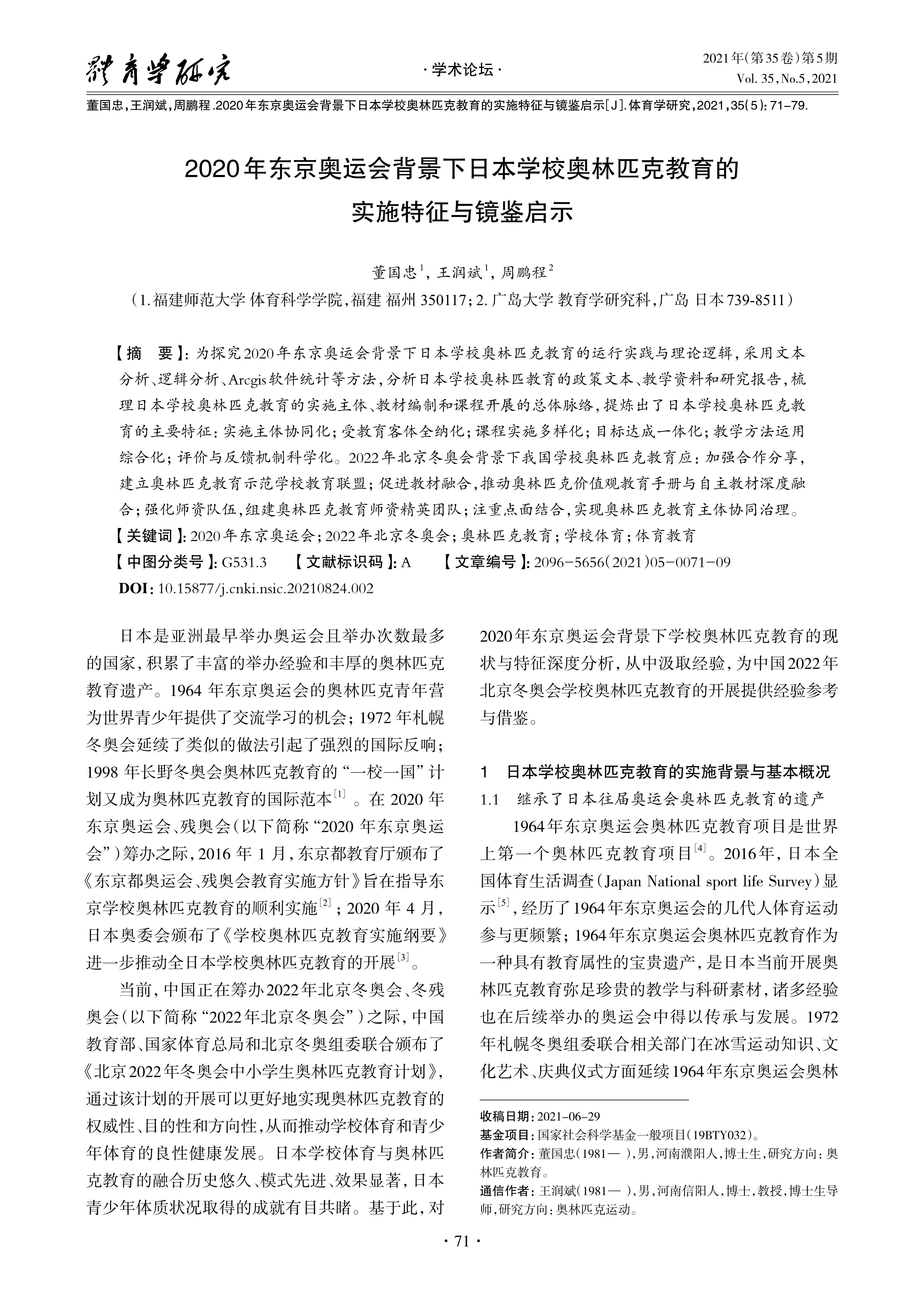 Aiming to explore the operational practice and theoretical logic of the Olympic education in Japanese schools under the background of the Tokyo 2020 Olympic Games, this article adopted the methods of text analysis, logic analysis and Arcgis software statistics to analyze the policy texts, teaching materials and research report of Olympic education in Japanese schools, and comb the implementation participants, the compilation of textbooks and the overall context of course development of the Olympic education in Japanese schools, and draw forth the following main characteristics of Olympic education in Japanese schools: collaboration of the main implementation participants; full-inclusion of education receivers; diversified implementation of curriculums; integration of education goals; comprehensive application of teaching methods; scientization of evaluation and feedback mechanism. Under the background of Beijing 2022 Winter Olympic Games, Chinese schools should strengthen cooperation and sharing in Olympic education, and establish the Olympic Education Model School Education Alliance; Facilitate the integration of teaching materials, and promote the deep integration of Olympic values education manuals and independent teaching materials; Strengthen the teaching staff, and build the elite team of Olympic education teachers; Pay attention to the combination of the general and the specifific, and realize the cooperative governance of Olympic education participants.