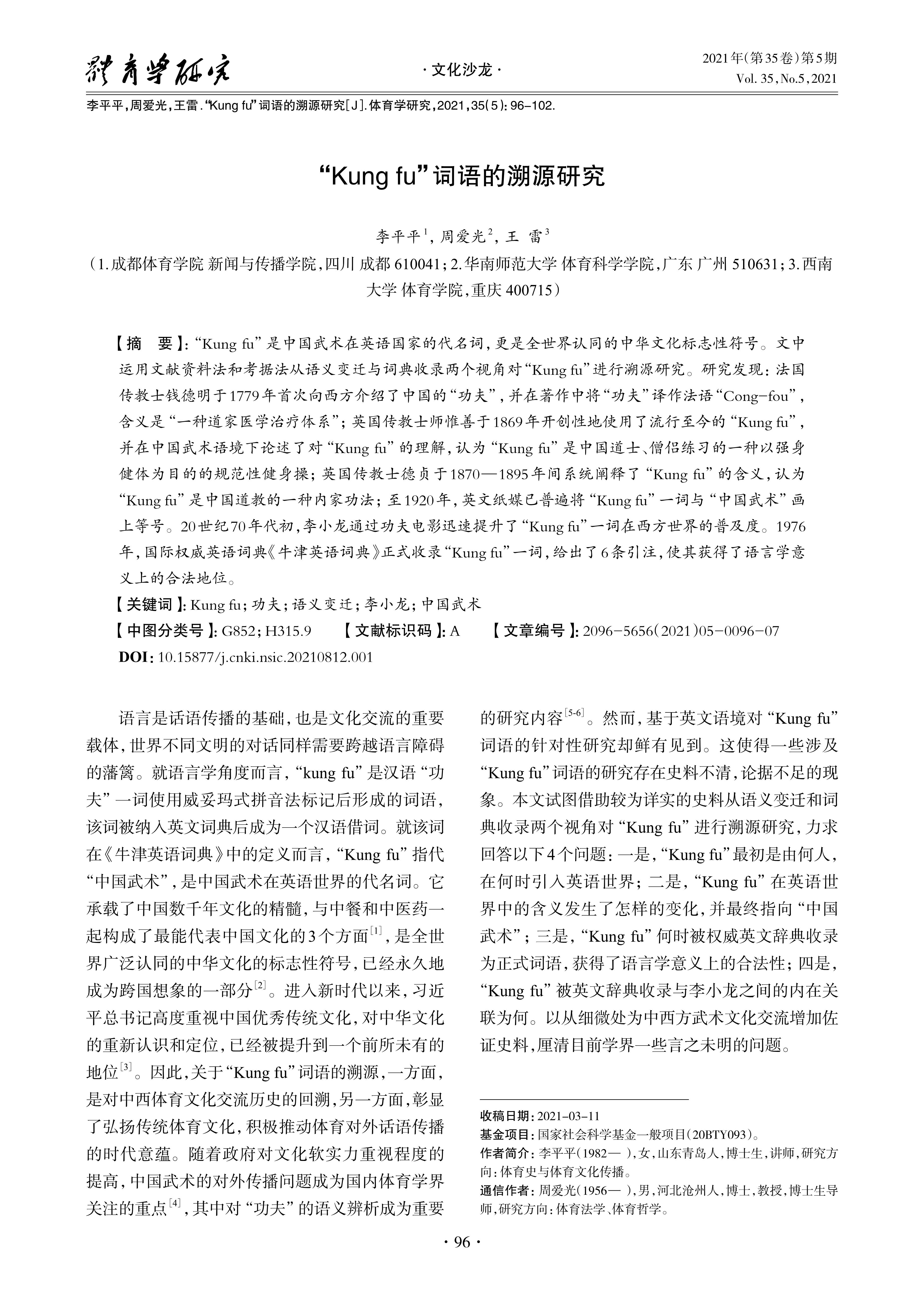“Kung fu” is the term for of Chinese martial arts in the English world, and also the symbol of Chinese culture recognized by the whole world. By using the methods of literature review and textual research, this paper studies the origin of “Kung fu” from the perspectives of semantic change and word collection. The research found that the French missionary Joseph-Marie Amiot fifirst introduced Chinese “Kung fu” to the West in 1779, and translated “Kung fu” into French “Congfou” in his work, meaning “a Taoist medical treatment system”; British missionary Frederick Porter Smith pioneered the use of the word “Kung fu” in 1869, which has been popular ever since. Frederick Porter Smith discussed the connotation of “Kung fu” in the context of Chinese martial arts terms, believing that “Kung fu” was a kind of “disciplinary Calisthenics” aiming at strengthening the body and was practiced by Chinese Taoists and monks; British missionary John Dudgeon systematically interpreted his understanding of “Kung fu” from 1870 to 1895, and believed that “Kung fu” is an internal form of Chinese Taoism exercises. By 1920, English paper media had generally equated the term “Kung fu” with “Chinese martial arts”. In the early 1970s, Bruce Lee quickly promoted the popularity of the word “Kung fu” through Kung fu movies. In 1976, the “Oxford English Dictionary” offificially included the word "Kung fu", making it linguistically legitimate.