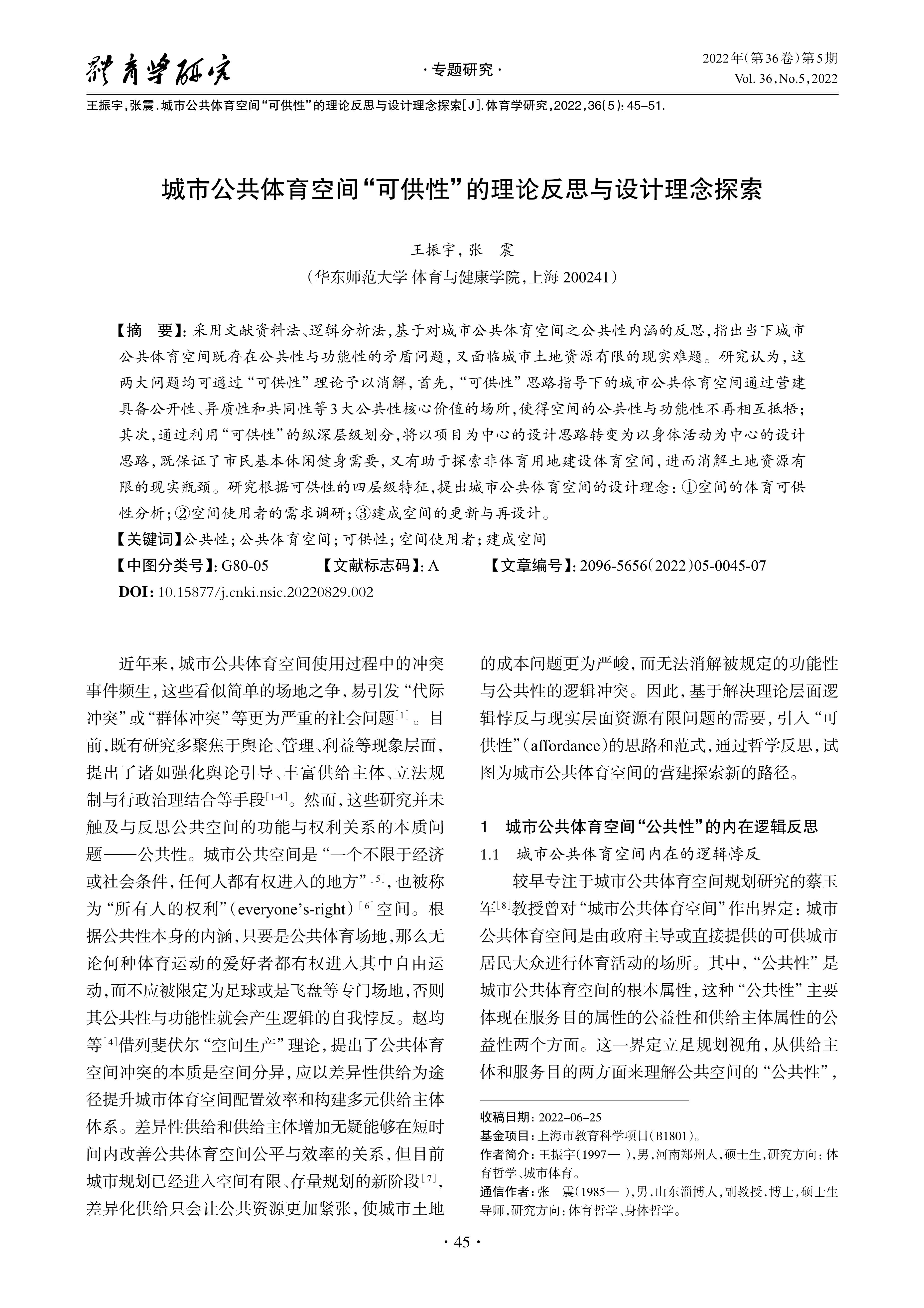 Based on the reflection on the connotation of publicity in urban public sports space,we use literature review and logical analysis to point out that there is a logical problem of contradiction between publicity and functionality in urban public sports space,and on the other hand,there is a practical challenge that resulted from the limited urban land resources. These two problems can be solved by introducing the theory of “affordance”. According to the study,firstly,the public sports space under the guidance of “affordance” can eliminate the contradiction between publicity and functionality of the space by creating a place featured by three core values of publicity: openness,heterogeneity and commonality. Secondly,by using the longitudinal hierarchy of “affordance”,the project-centered design concept is transformed into a physical activity-centered design concept, which not only ensures people’ basic leisure and fitness demands but also helps to explore the construction of sports space on non-sporting land,thus breaks the real bottleneck of limited land resources. Finally,based on the four levels of affordance, three design concepts for urban public sports spaces are proposed:①sports affordance analysis of spaces;②demand investigation of space users;③ renewal and redesign of established spaces.