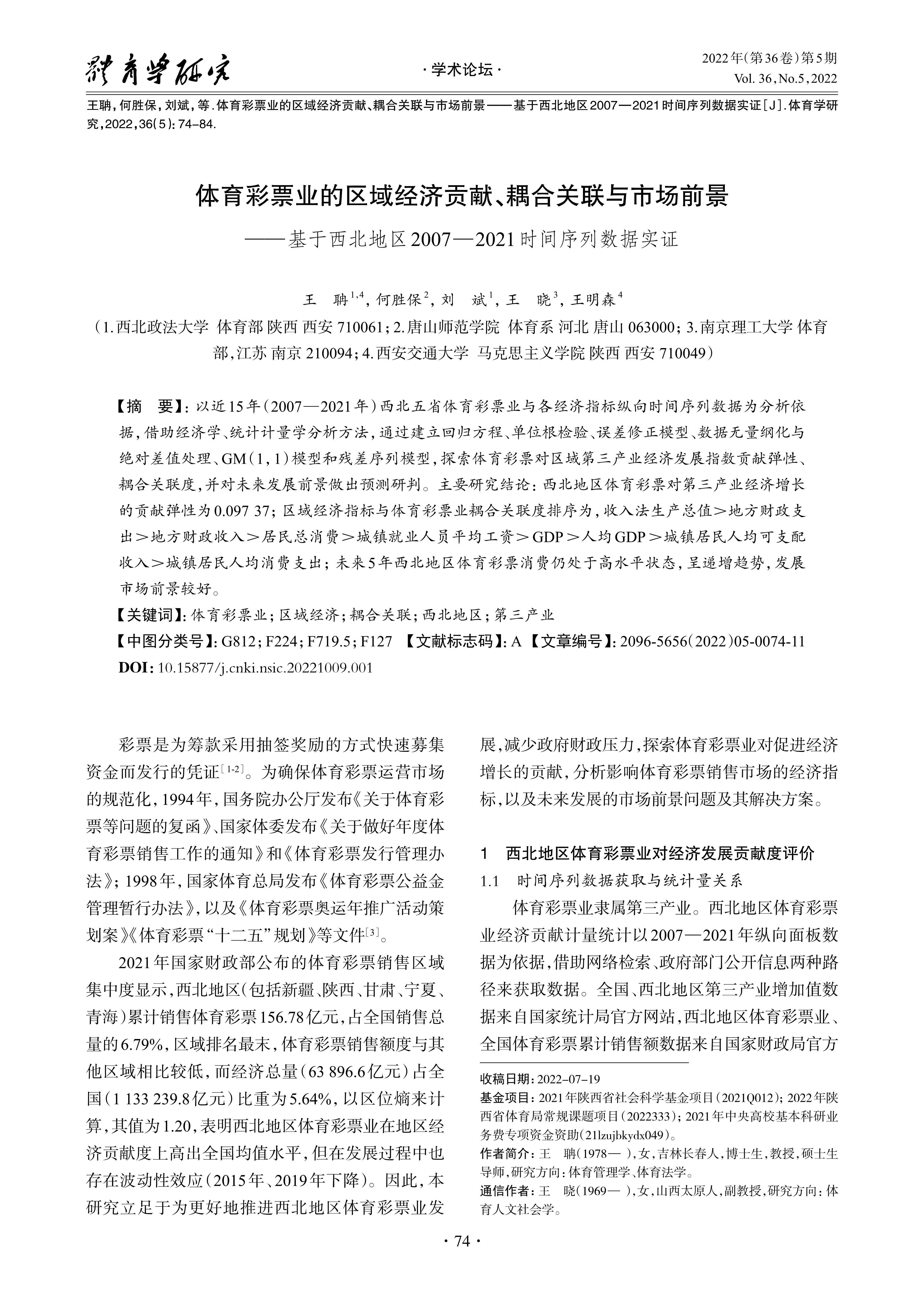 Based on the longitudinal time series data of sports lottery industry and economic indicators in five provinces of northwest China in recent 15 years (2007—2021),with the help of analysis methods in economics and statistical metrology, this paper explores the contribution elasticity of sports lottery to the economic development index and the coupling correlation degree of regional tertiary industry,and offers prediction and judgment on the future development through the establishment of regression equation,unit root test,error correction model,data dimensionless and absolute difference processing,GM (1, 1) model and residual series model. The following conclusions can be drawn from the present study: the contribution elasticity of sports lottery to the economic growth of the tertiary industry in northwest China is 0.097 37; The order of the coupling correlation between regional economic indicators and sports lottery industry is as follows: GDP with income approach> local fiscal expenditure > local fiscal revenue > total consumption of residents > average wage of urban employees > GDP > per capita GDP > per capita disposable income of urban residents > per capita consumption expenditure of urban residents; In the next five years,the consumption of sports lottery in northwest China is still at a high level,showing an increasing trend,and the market prospect is believed to be favorable.