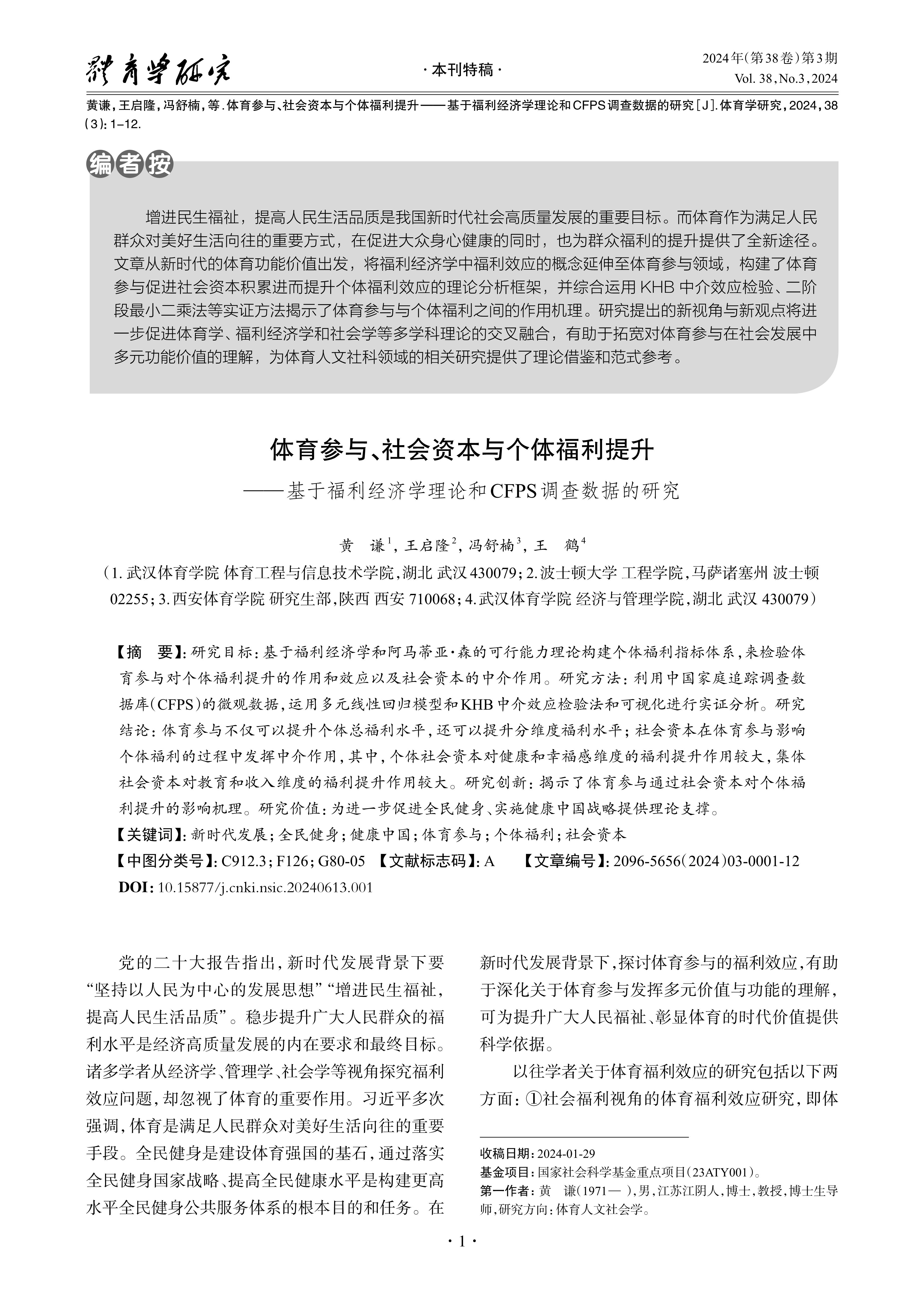 研究目标:基于福利经济学和阿马蒂亚·森的可行能力理论构建个体福利指标体系,来检验体 育参与对个体福利提升的作用和效应以及社会资本的中介作用。研究方法:利用中国家庭追踪调查数 据库(CFPS)的微观数据,运用多元线性回归模型和 KHB中介效应检验法和可视化进行实证分析。研究 结论:体育参与不仅可以提升个体总福利水平,还可以提升分维度福利水平;社会资本在体育参与影响 个体福利的过程中发挥中介作用,其中,个体社会资本对健康和幸福感维度的福利提升作用较大,集体 社会资本对教育和收入维度的福利提升作用较大。研究创新:揭示了体育参与通过社会资本对个体福 利提升的影响机理。研究价值:为进一步促进全民健身、实施健康中国战略提供理论支撑。