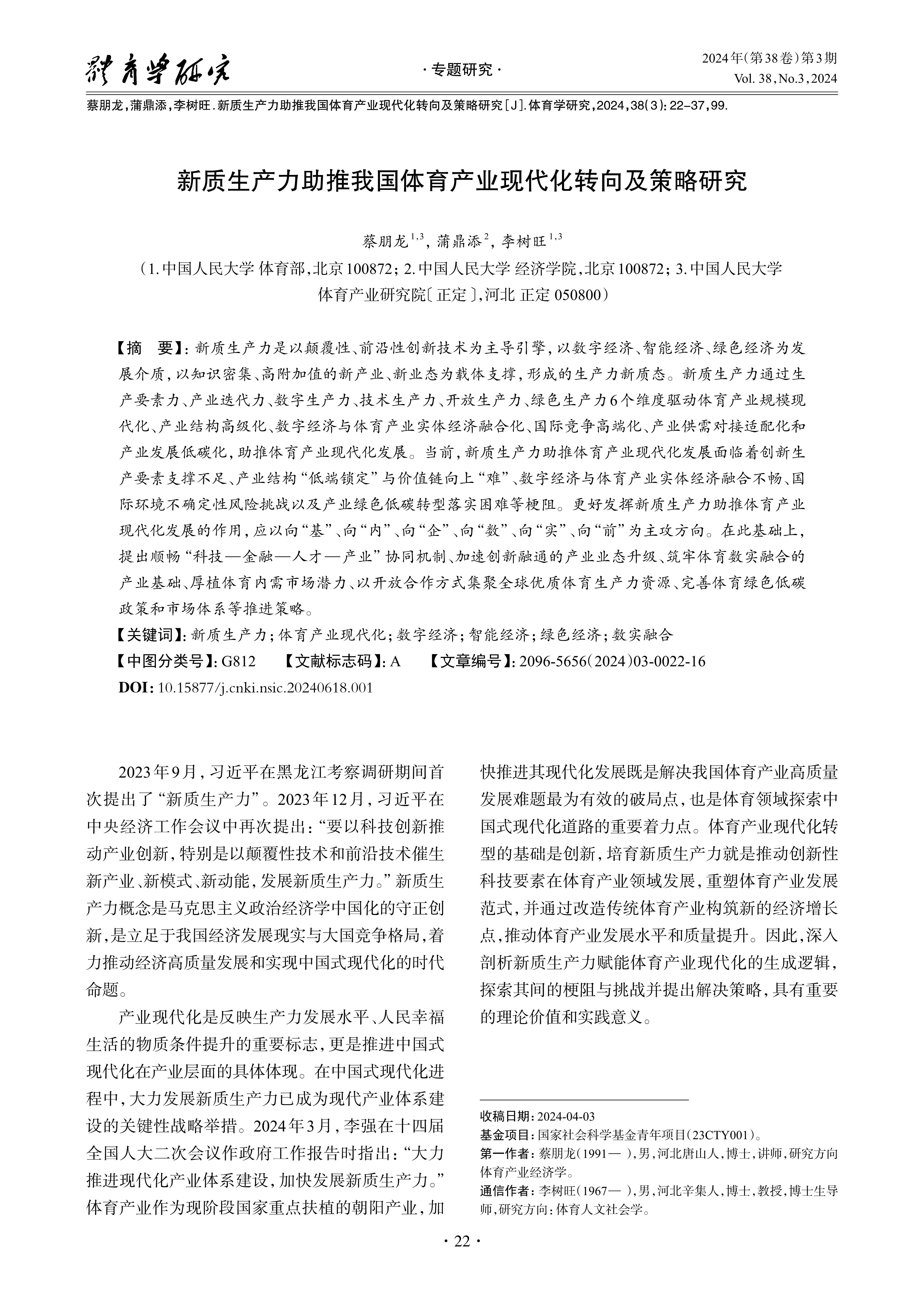 New quality productive forces refers to a new quality of productivity formed by taking disruptive and cuttingedge innovative technologies as the leading engine, digital economy, intelligent economy and green economy as the medium for development, and knowledge intensive and high value-added new industries and new business forms as the carrier. The new quality productive forces drives the modernization of sports industry through six dimensions: production factor force, industrial iterative force, digital productivity, technical productivity, open productivity and green productivity, which also promotes large-scale modernization of sports industry, upgraded industrial structure, integration of digital economy and real economy of sports industry, high-end international competition, adaptability of industrial supply and demand and lowcarbon industrial development. At present, the modernization of sports industry facilitated by new quality productive forces faces obstacles such as insufficient support for innovative production factors,“low-end locking” of industrial structure and “difficulty” in the upward value chain, poor integration of digital economy and real economy of sports industry, risks of international environment uncertainty and difficulties in implementing green and low-carbon transformation. In order to give full play to the role of new quality productive forces in promoting the modernization of sports industry, we should focus on “base”,“inside”,“enterprise”,“data”,“reality” and“front” . On this basis, the current study puts forward the promotion strategies such as smoothing the coordination mechanism of“science-finance-talent-industry”, accelerating the upgrading of innovative and integrated industrial forms, building an industrial foundation for the integration of sports data and reality, cultivating the market potential of domestic demand for sports, gathering global high-quality sports productivity resources in an open and cooperative manner, and improving green and low-carbon sports policies and market systems.