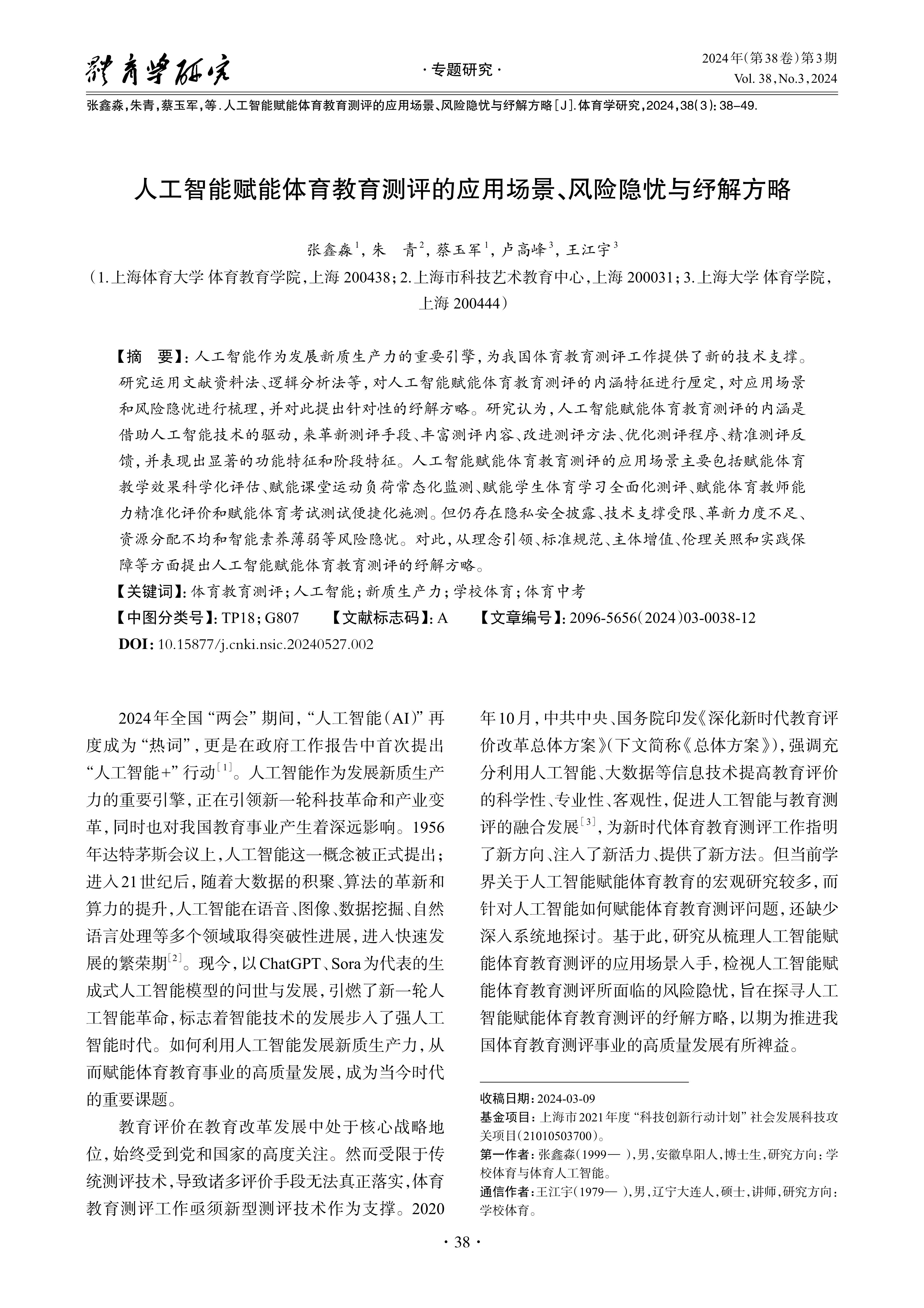 人工智能作为发展新质生产力的重要引擎,为我国体育教育测评工作提供了新的技术支撑。 研究运用文献资料法、逻辑分析法等,对人工智能赋能体育教育测评的内涵特征进行厘定,对应用场景 和风险隐忧进行梳理,并对此提出针对性的纾解方略。研究认为,人工智能赋能体育教育测评的内涵是 借助人工智能技术的驱动,来革新测评手段、丰富测评内容、改进测评方法、优化测评程序、精准测评反 馈,并表现出显著的功能特征和阶段特征。人工智能赋能体育教育测评的应用场景主要包括赋能体育 教学效果科学化评估、赋能课堂运动负荷常态化监测、赋能学生体育学习全面化测评、赋能体育教师能 力精准化评价和赋能体育考试测试便捷化施测。但仍存在隐私安全披露、技术支撑受限、革新力度不足、 资源分配不均和智能素养薄弱等风险隐忧。对此,从理念引领、标准规范、主体增值、伦理关照和实践保 障等方面提出人工智能赋能体育教育测评的纾解方略。