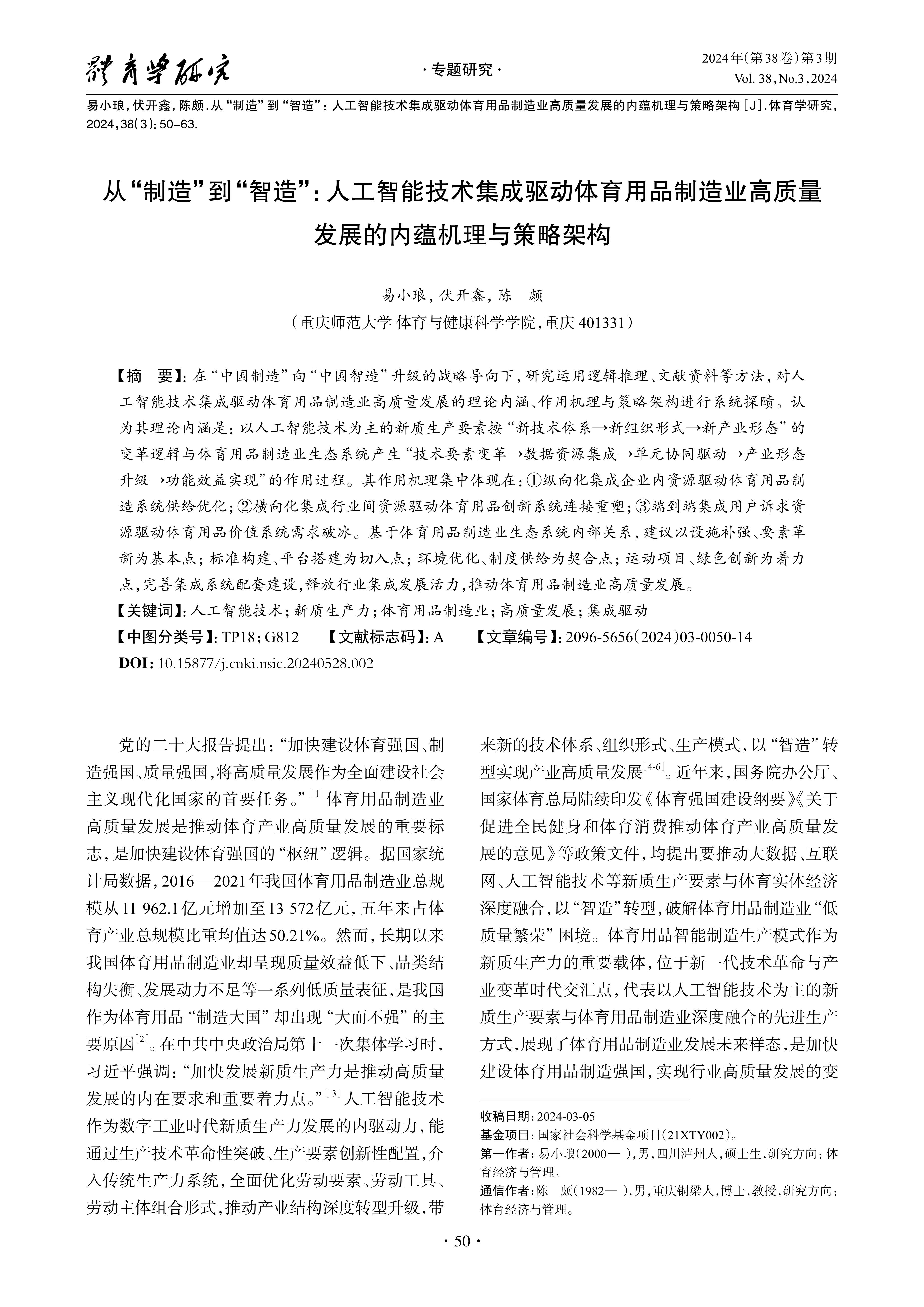 在“中国制造”向“中国智造”升级的战略导向下,研究运用逻辑推理、文献资料等方法,对人 工智能技术集成驱动体育用品制造业高质量发展的理论内涵、作用机理与策略架构进行系统探赜。认 为其理论内涵是:以人工智能技术为主的新质生产要素按“新技术体系→新组织形式→新产业形态”的 变革逻辑与体育用品制造业生态系统产生“技术要素变革→数据资源集成→单元协同驱动→产业形态 升级→功能效益实现”的作用过程。其作用机理集中体现在:①纵向化集成企业内资源驱动体育用品制 造系统供给优化;②横向化集成行业间资源驱动体育用品创新系统连接重塑;③端到端集成用户诉求资 源驱动体育用品价值系统需求破冰。基于体育用品制造业生态系统内部关系,建议以设施补强、要素革 新为基本点;标准构建、平台搭建为切入点;环境优化、制度供给为契合点;运动项目、绿色创新为着力 点,完善集成系统配套建设,释放行业集成发展活力,推动体育用品制造业高质量发展。
