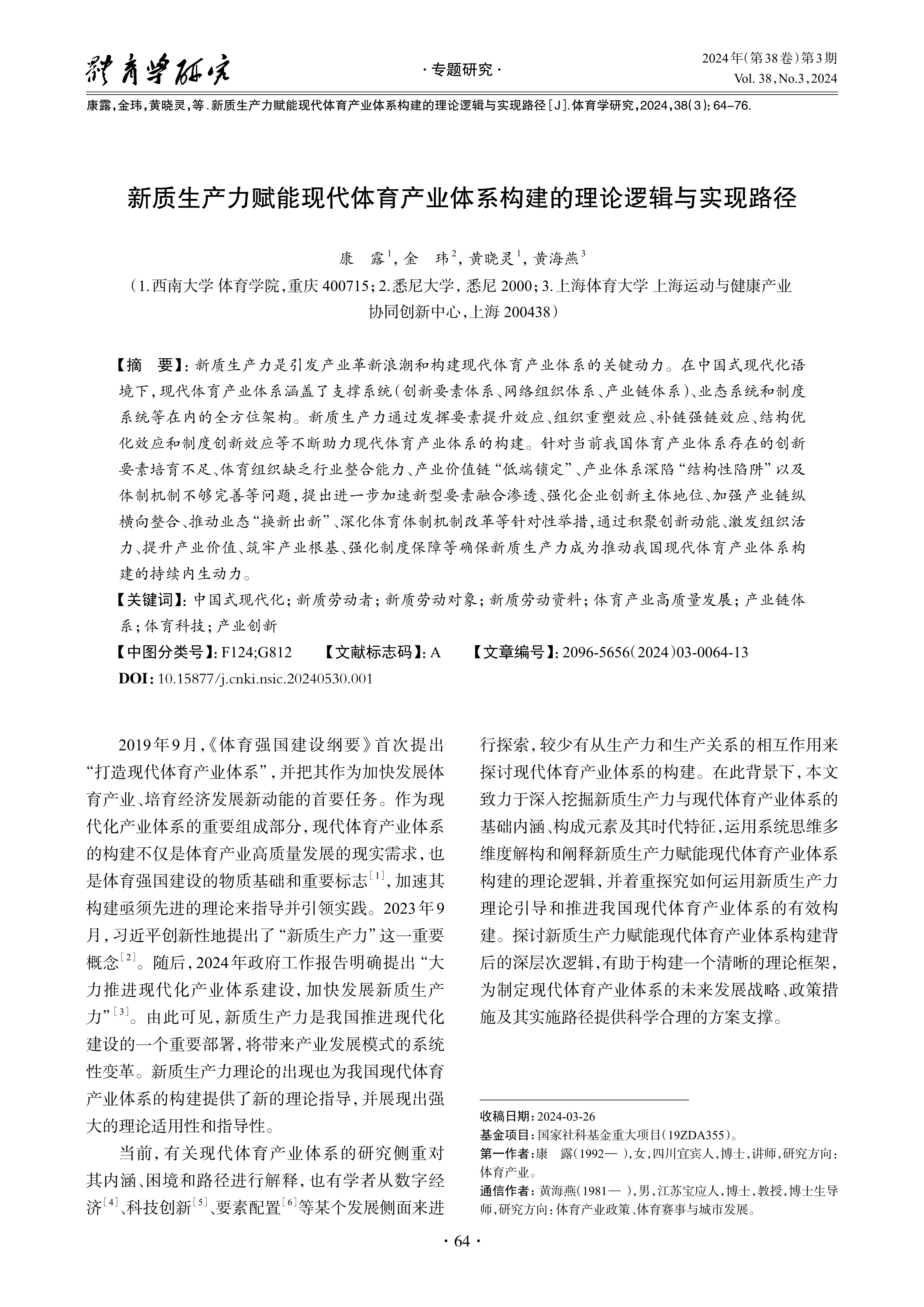 New productive forces are the key driving force behind the wave of industrial innovation and the construction of a modern sports industry system. In the context of Chinese path to modernization, the modern sports industry system covered a comprehensive framework including the support system(innovation element system, network organization system, industrial chain system), business format system and institutional system. The new quality productive forces continuously contributed to the construction of the modern sports industry system through the effects of factor enhancement, organizational restructuring, supply chain strengthening, structural optimization, and institutional innovation. In response to the current problems in China’ s sports industry system, such as insufficient cultivation of innovative elements, lack of industry integration in sports organizations,“low-end lock-in” of the industrial value chain, prominent“structural traps” of the industry system, and inadequate institutional mechanisms, targeted measures are proposed to further accelerate the integration and penetration of new production factors, strengthen the position of enterprise innovation as the main body, strengthen the vertical and horizontal integration of the industrial chain, promote the“replacement of new and emerging” industrial formats, and deepen the reform of the sports mechanism system. By accumulating innovation momentum, stimulating organizational vitality, enhancing industrial value, building a solid industrial foundation, and strengthening institutional guarantees, new quality productive forces become the sustained endogenous driving force for the construction of China’ s modern sports industry system.