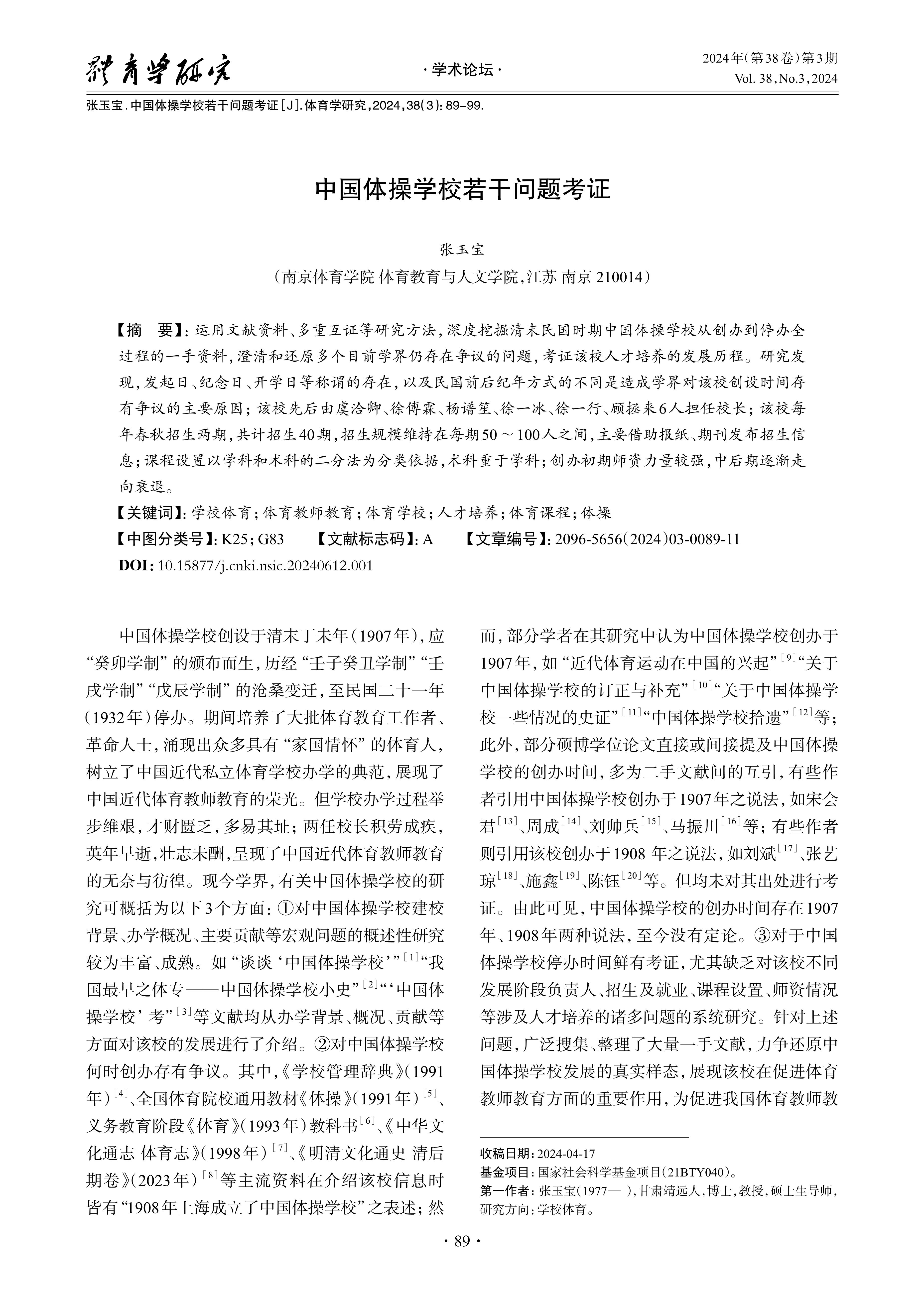 运用文献资料、多重互证等研究方法,深度挖掘清末民国时期中国体操学校从创办到停办全 过程的一手资料,澄清和还原多个目前学界仍存在争议的问题,考证该校人才培养的发展历程。研究发 现,发起日、纪念日、开学日等称谓的存在,以及民国前后纪年方式的不同是造成学界对该校创设时间存 有争议的主要原因;该校先后由虞洽卿、徐傅霖、杨谱笙、徐一冰、徐一行、顾拯来6人担任校长;该校每 年春秋招生两期,共计招生40期,招生规模维持在每期50~100人之间,主要借助报纸、期刊发布招生信 息;课程设置以学科和术科的二分法为分类依据,术科重于学科;创办初期师资力量较强,中后期逐渐走 向衰退。