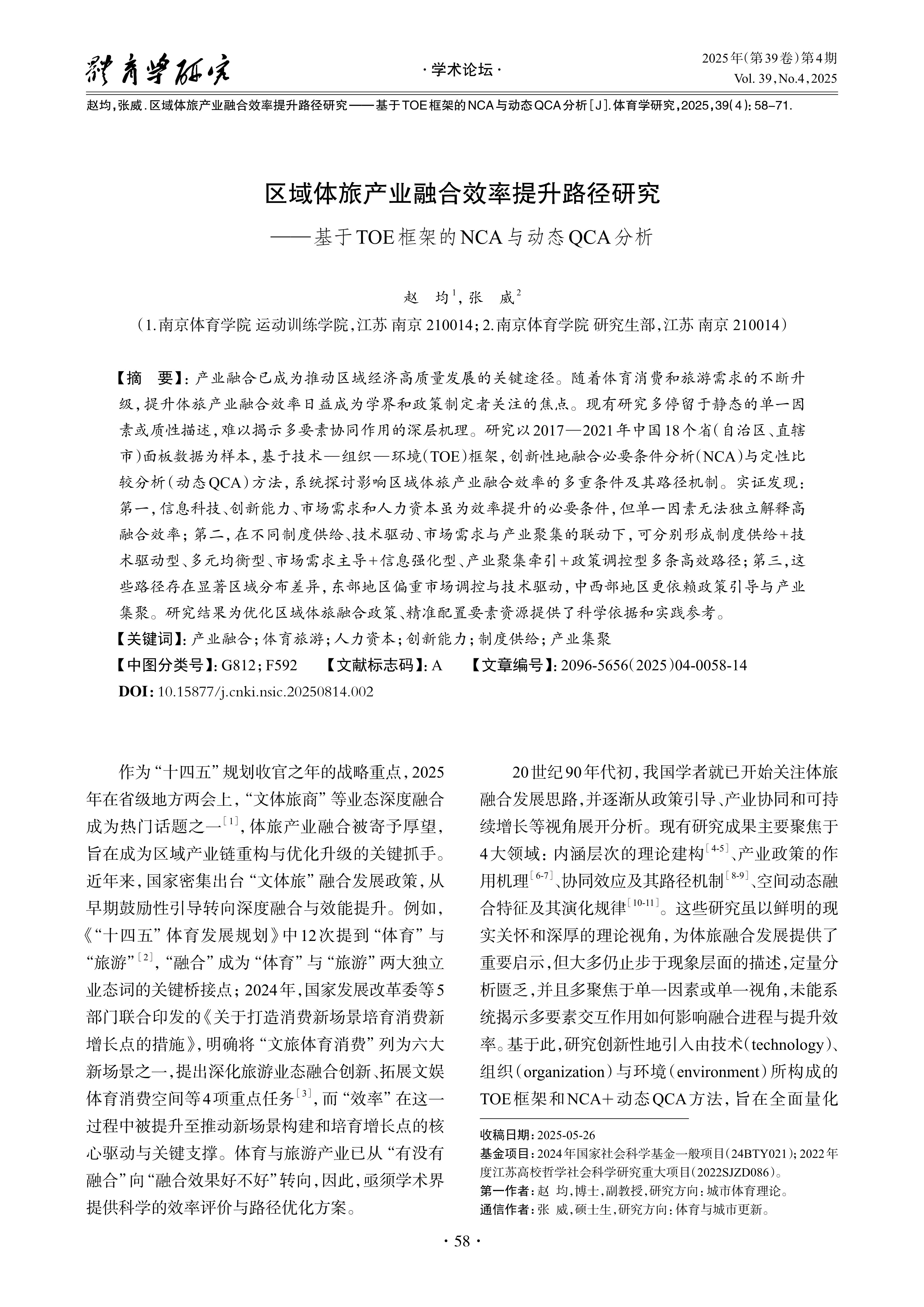 赵均,张威.区域体旅产业融合效率提升路径研究——基于 TOE 框架的 NCA 与动态 QCA 分析[J].体育学研究,2025,39(4):58-71