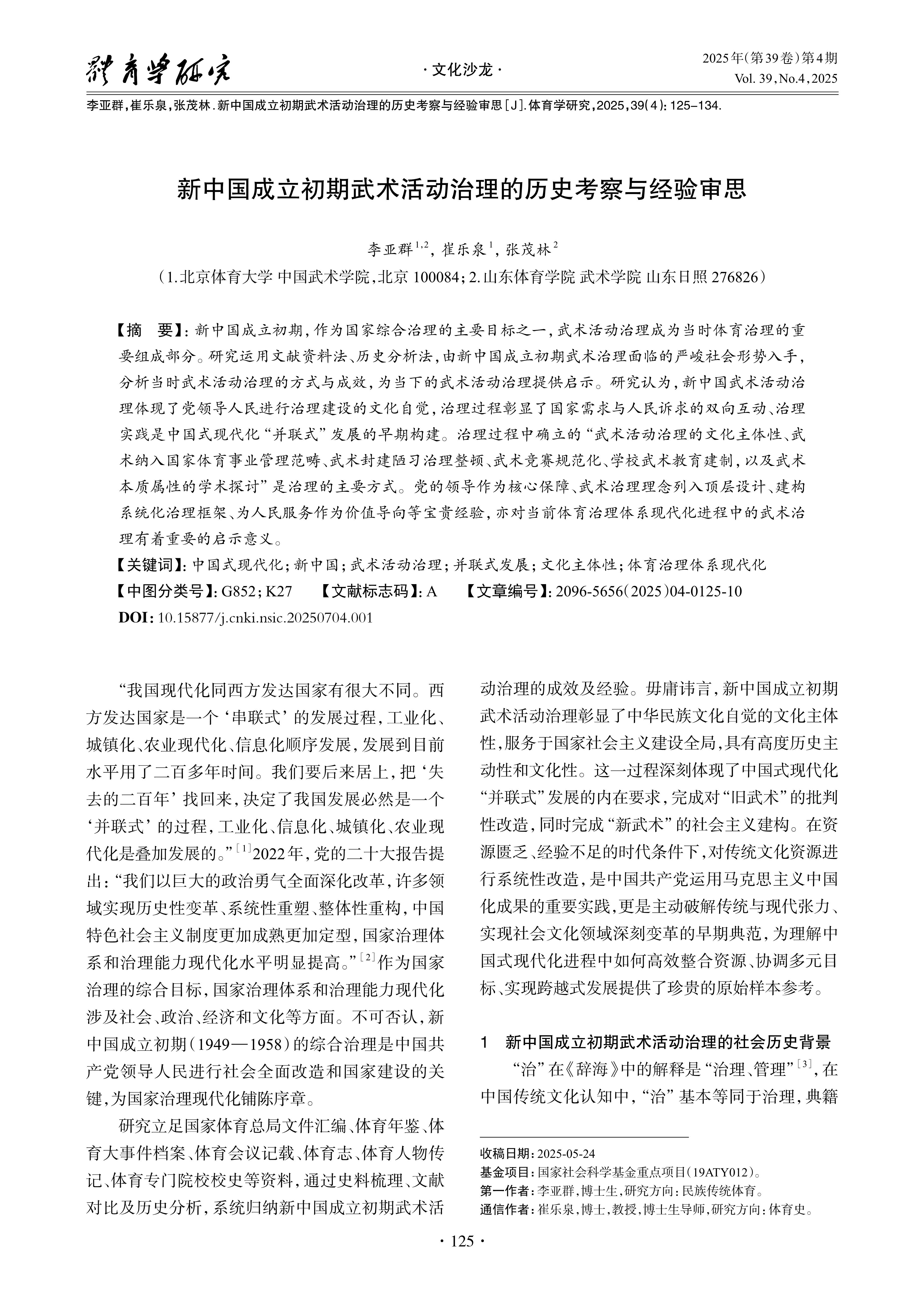 李亚群,崔乐泉,张茂林.新中国成立初期武术活动治理的历史考察与经验审思[J].体育学研究,2025,39(4):125-134