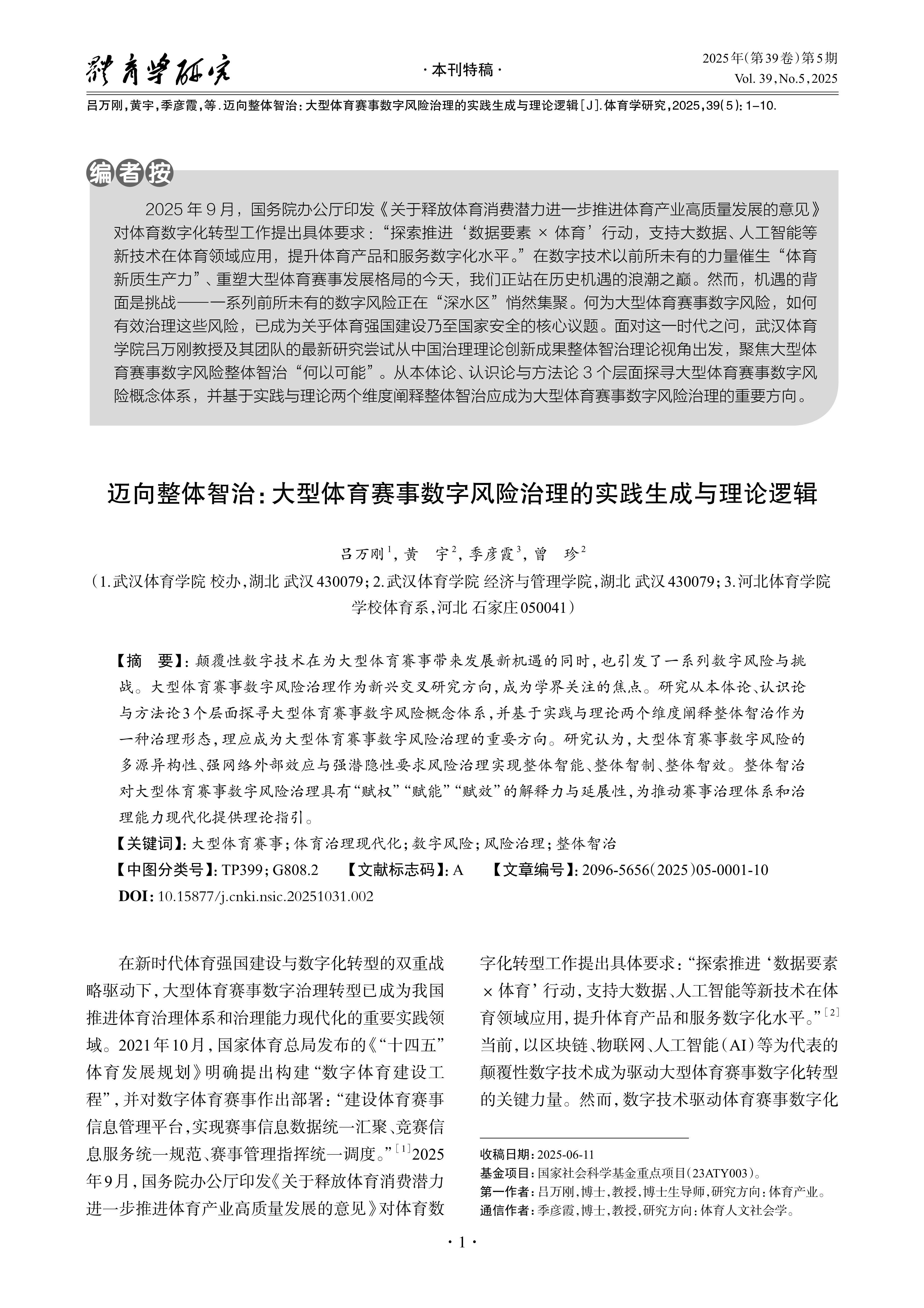 吕万刚, 黄 宇, 季彦霞, 等.迈向整体智治:大型体育赛事数字风险治理的实践生成与理论逻辑[J].体育学研究,2025,39(5):1-10