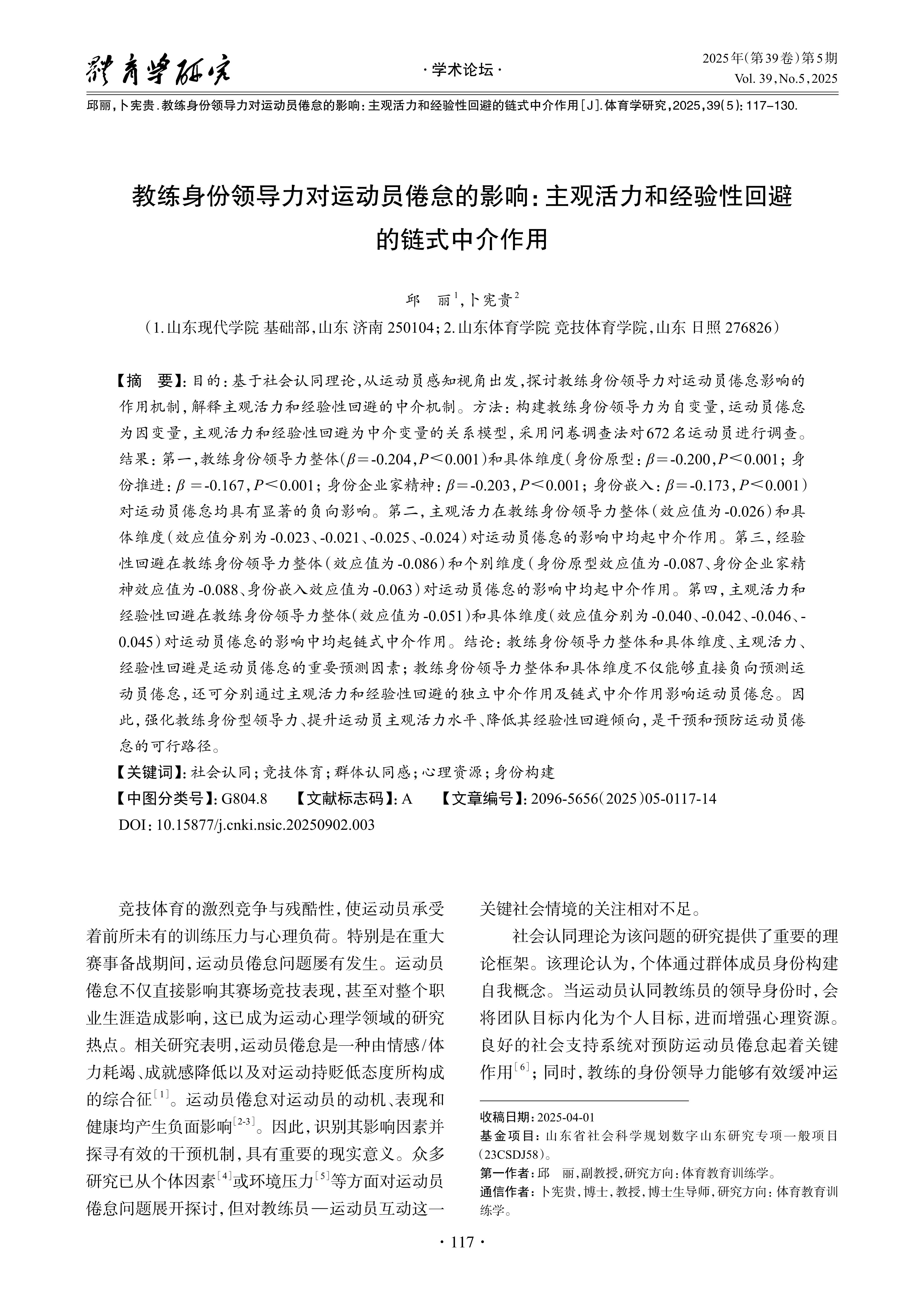 教练身份领导力对运动员倦怠的影响:主观活力和经验性回避的链式中介作用
